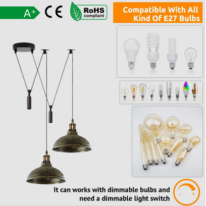 | Package Included | - 1 x Ceiling Rose with Fitting Accessories - 2 X E27 Holder Pendant with 195cm Cable (Bulb are included) - 2 x Lampshade - 2 x Upper Pulley - 2 x Lower Pulley Wheel |