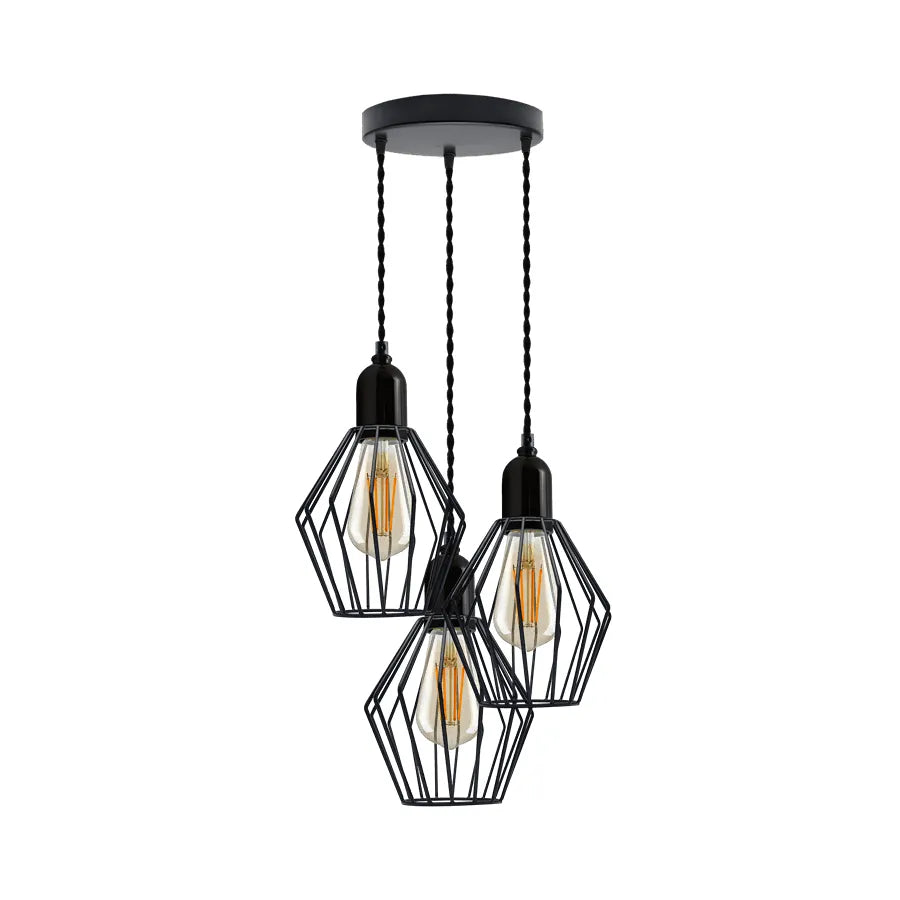 - Industrial style Black painted 3 way Round Ceiling rose cluster pendant light with bulb guard wire cage.