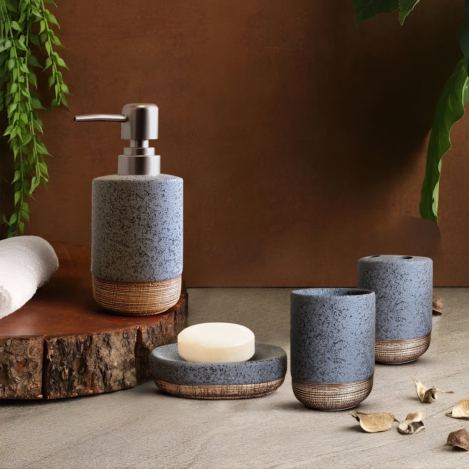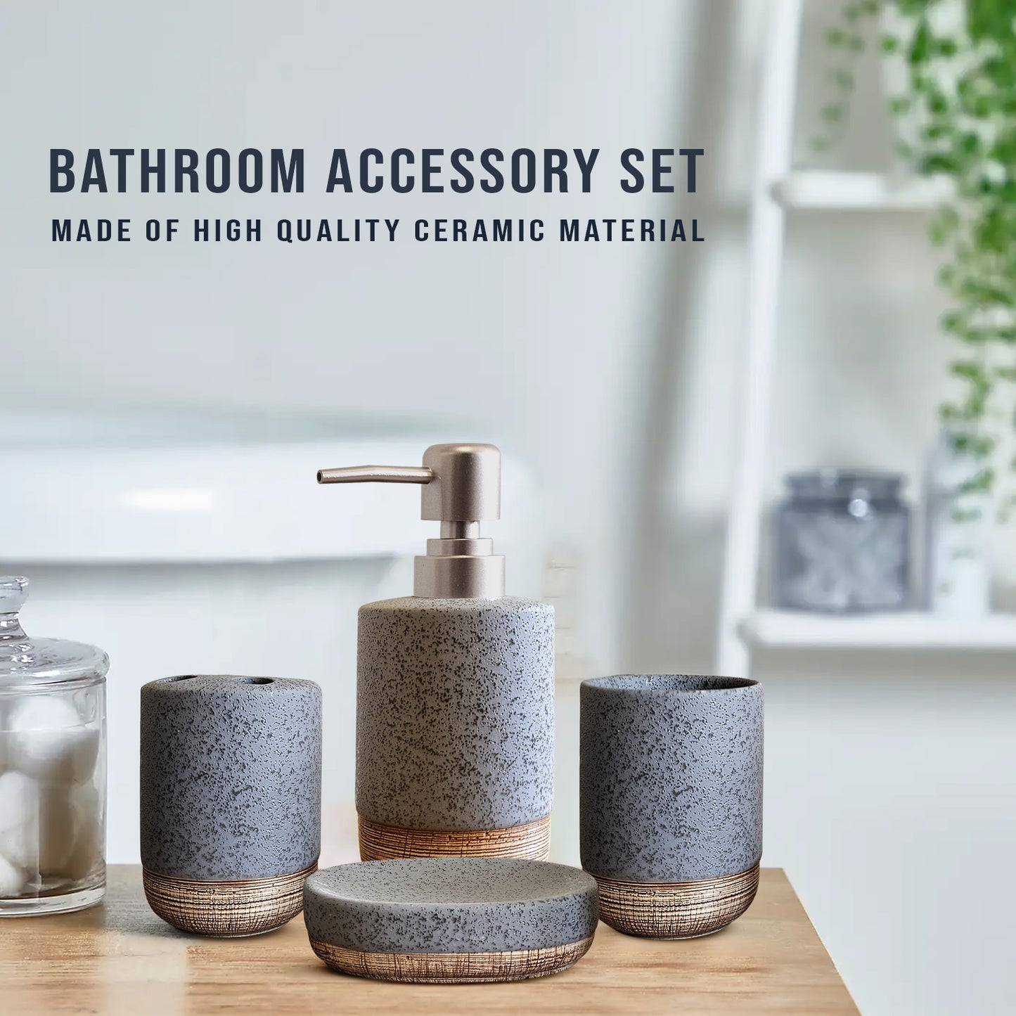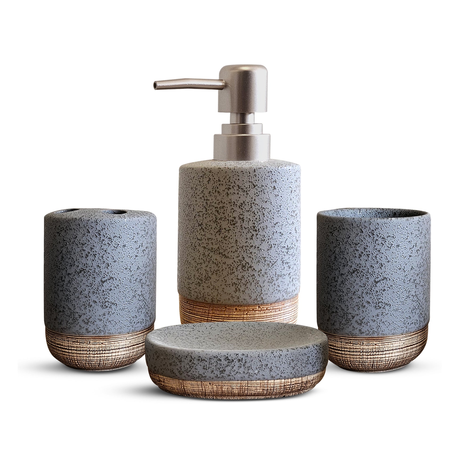 - Included components: Toothbrush Holder, Lotion Dispenser, Tumbler, Soap Dish