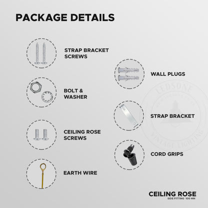 Ceiling Rose fixing brackets, screws, washers and matching screw caps are included.