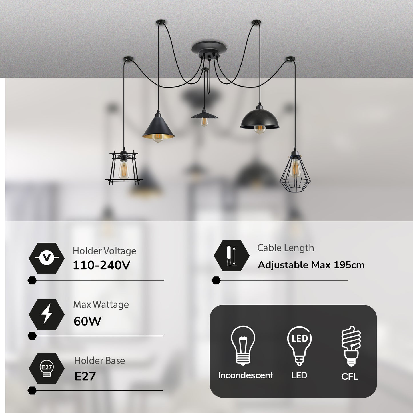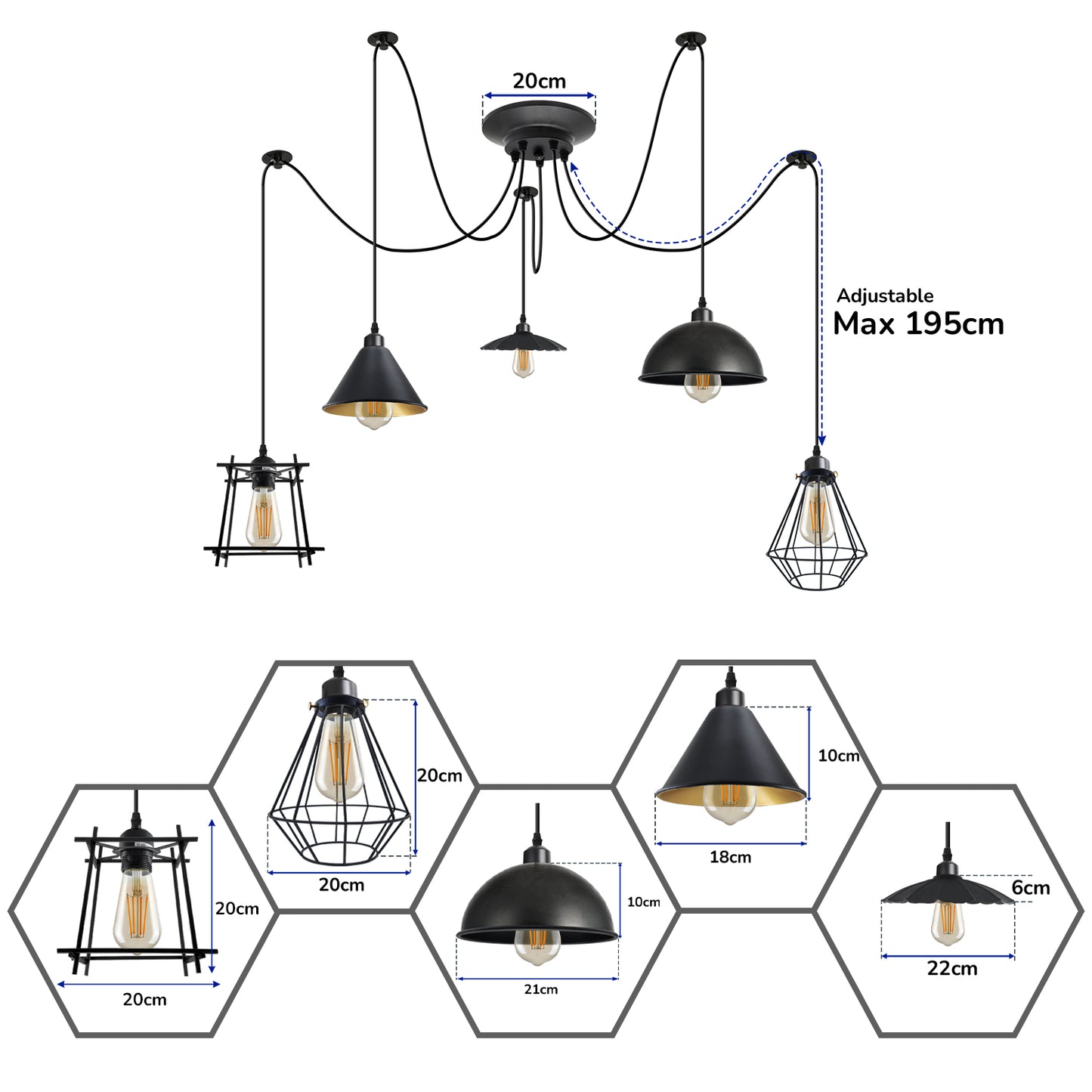 | Package Includes | 1 x Ceiling Rose with Fitting Accessories 5 x Holder with PVC Cable 5 x different Lampshade and wire Cage 5 x Ceiling Hooks Bulbs are Optional |