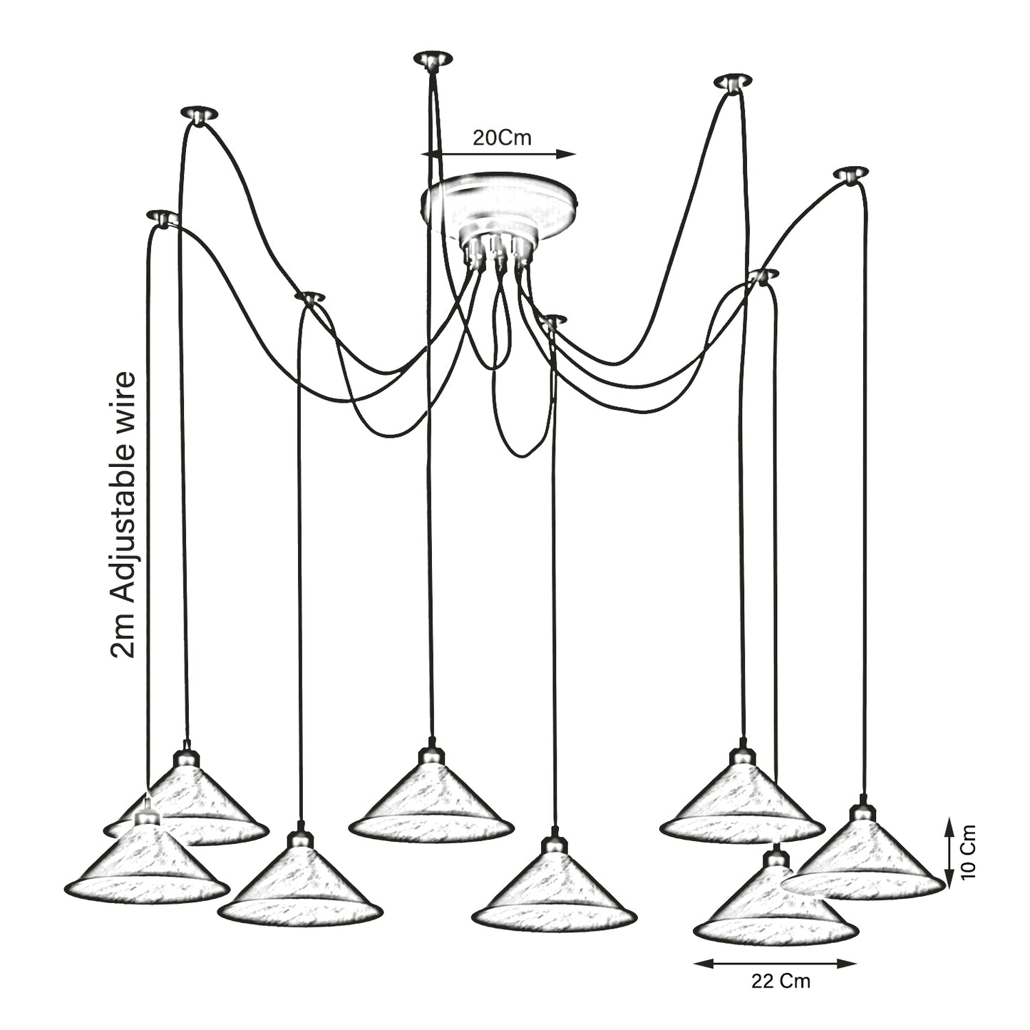 | Package Includes | 1 X 8 Head Ceiling Spider Light (8x Light Shades, 8x E27 Holder with 2m Cable, 8x Upper Pully Parts, Ceiling Rose with Accessories - The Bulbs are Optional) |