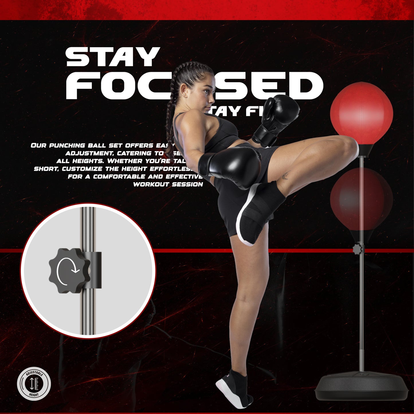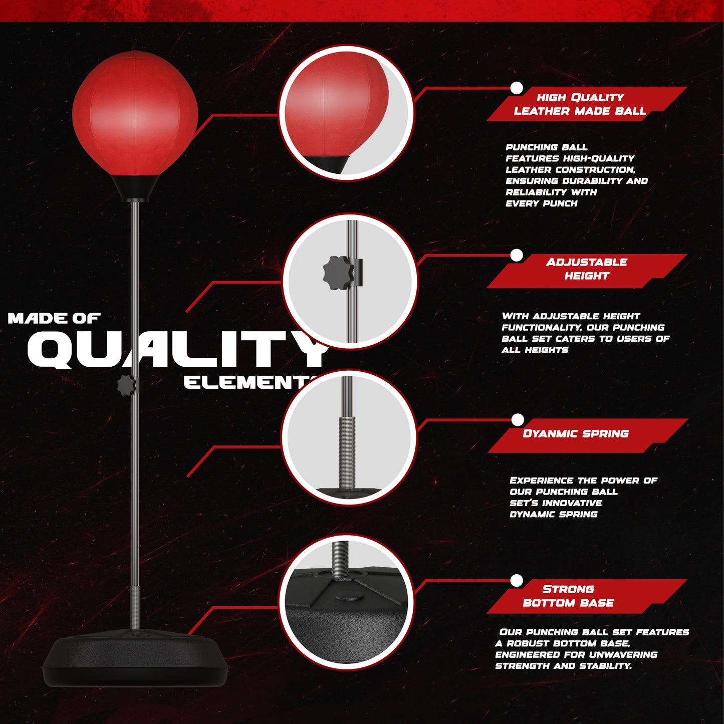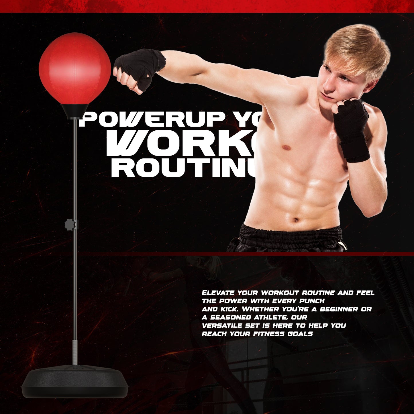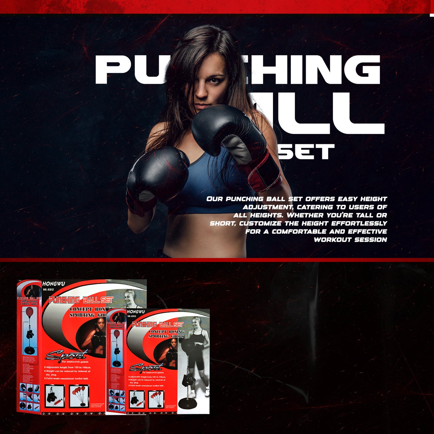- The punching ball set includes a freestanding boxing ball with gloves and an air pump, featuring a balanced base filled with sand and water for stability.