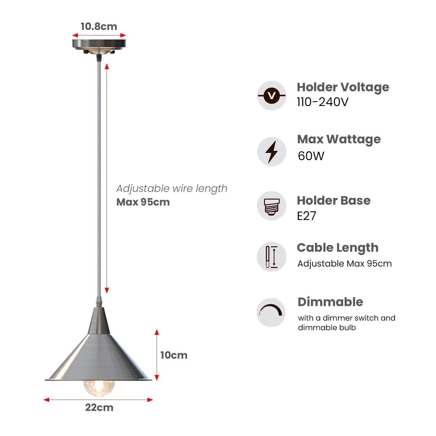 - Dimensions: shade width 22cm x height 10cm; ceiling rose width 10.8cm; Cable Length:95cm (Adjustable)
