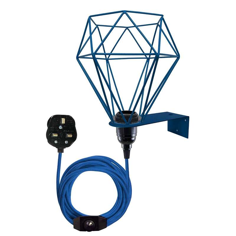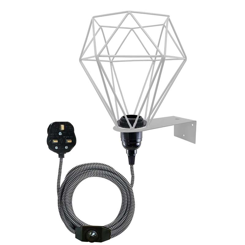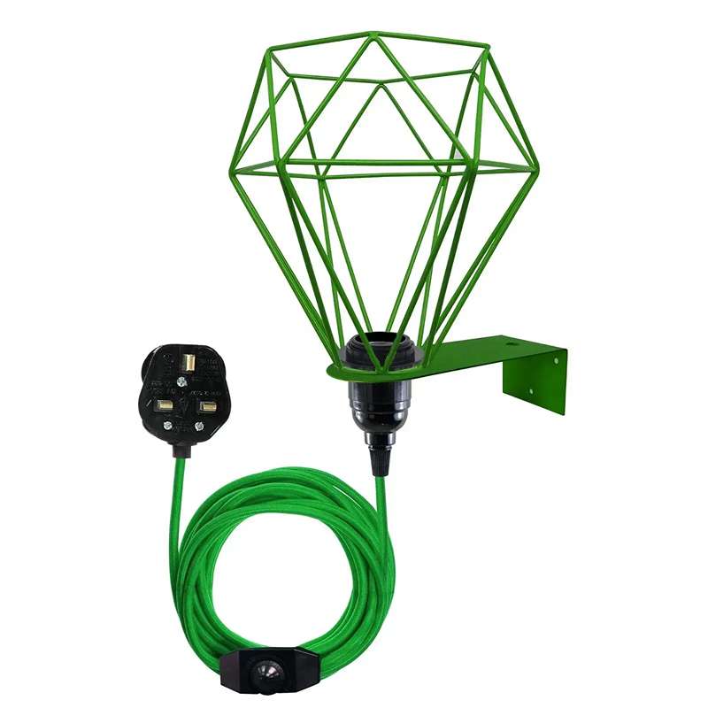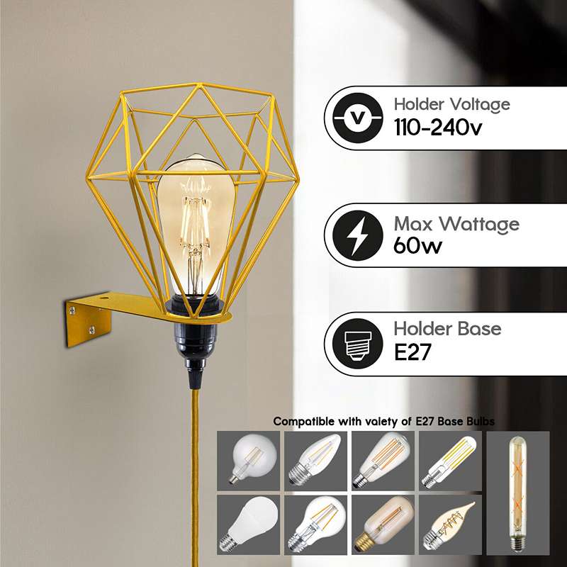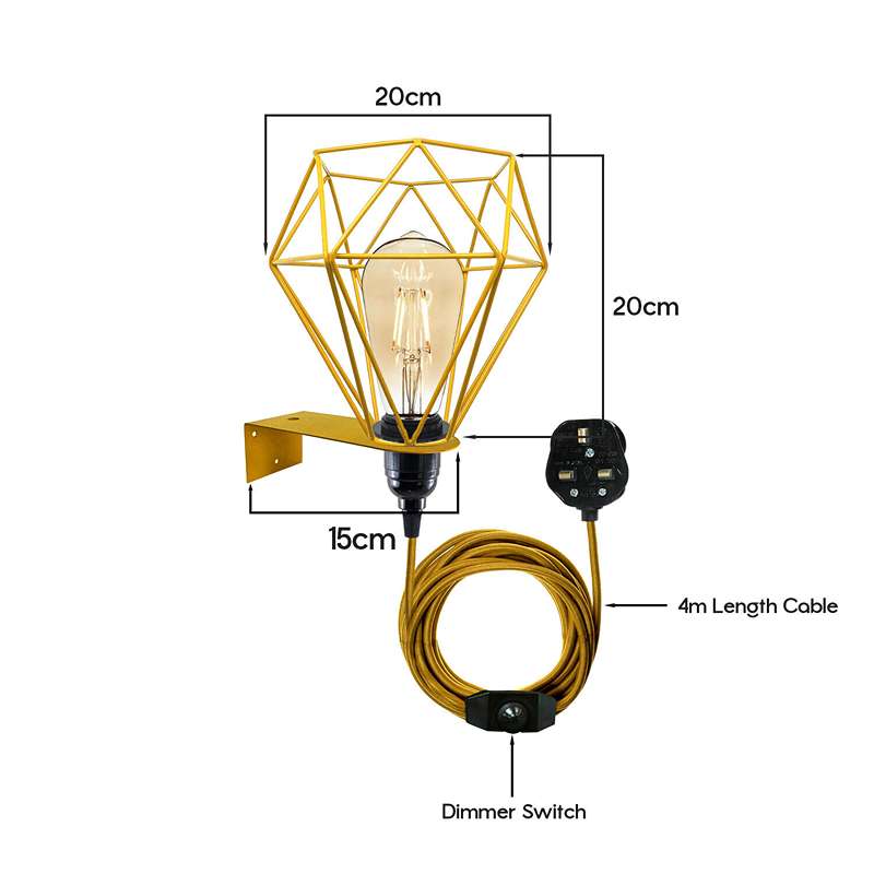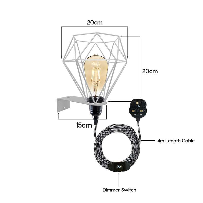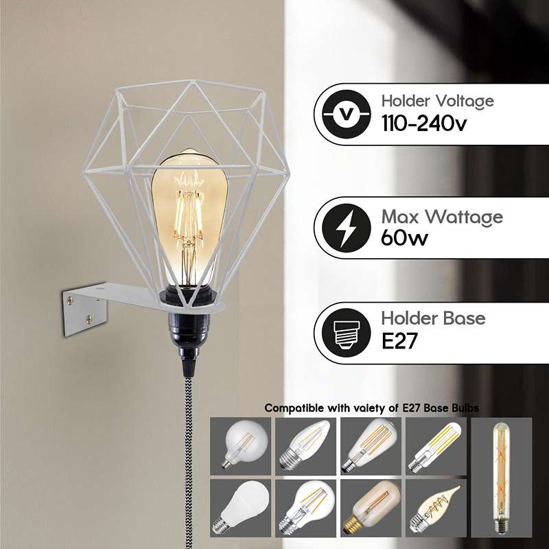 - Come with 2 meters of fabric cable, Dimmer switch, 13A UK 3 pin plug and Bakelite E27 screw bulb holder, metal cage & wall mounting plate.
