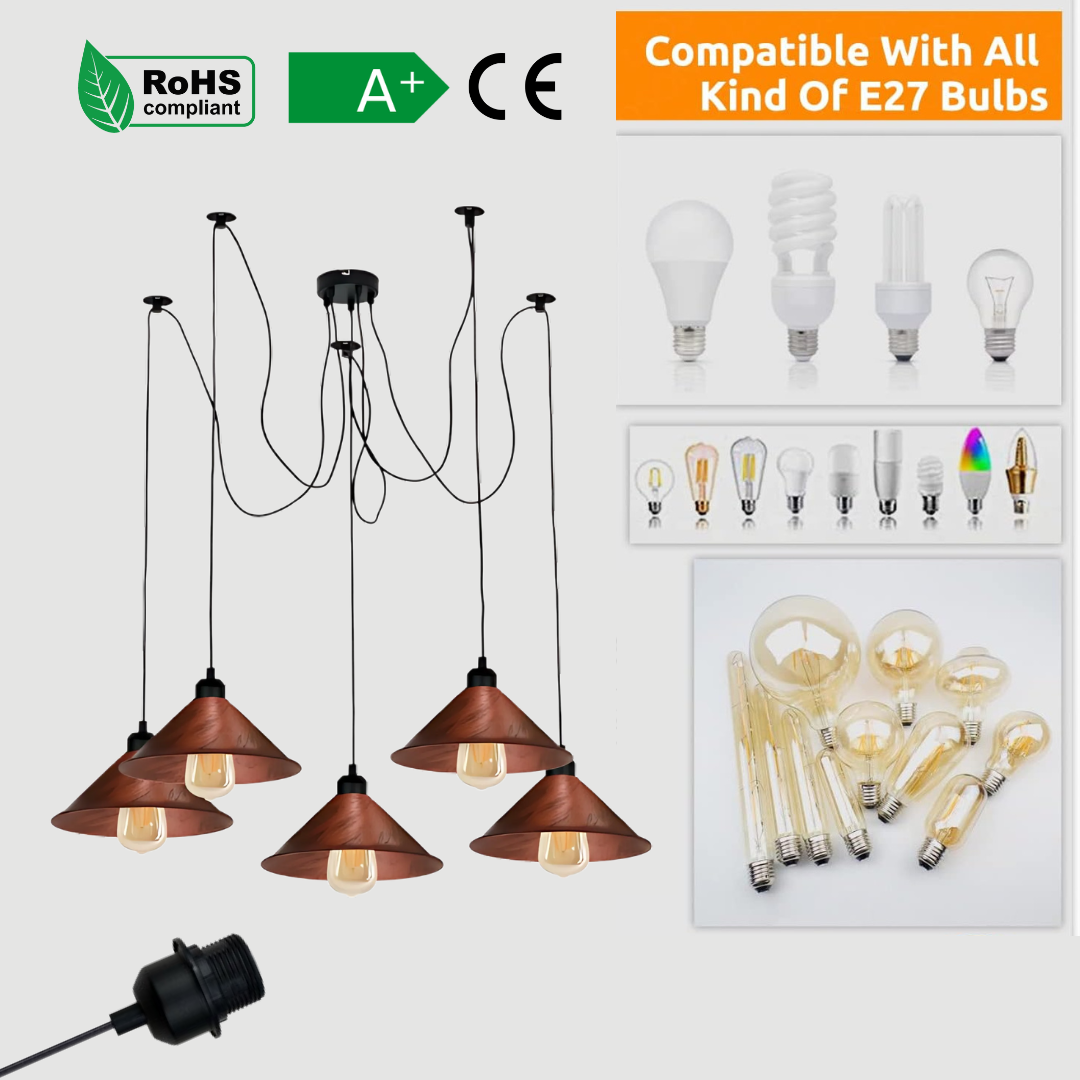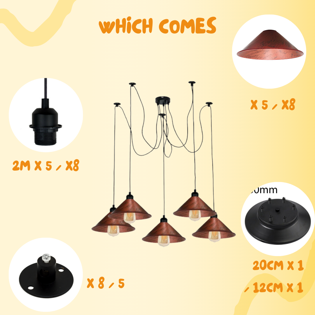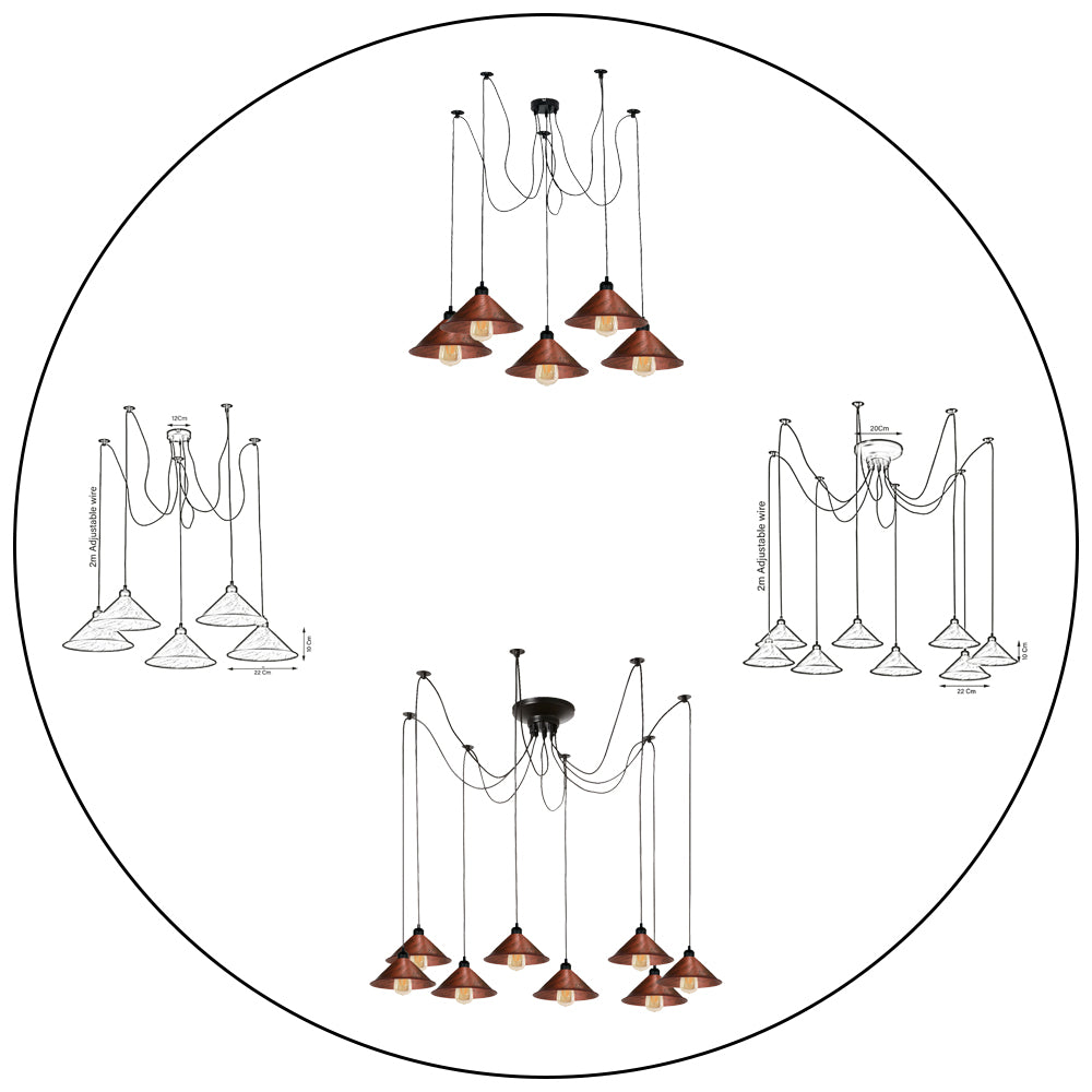 | Package Includes | - 5/8 x Light Holder with 2m Cable - 5/8 x Upper Pulley - 1 x Pendant Lamp Base (20cm x 25mm) - 1 x Assembly Parts (Bulbs are optional) |