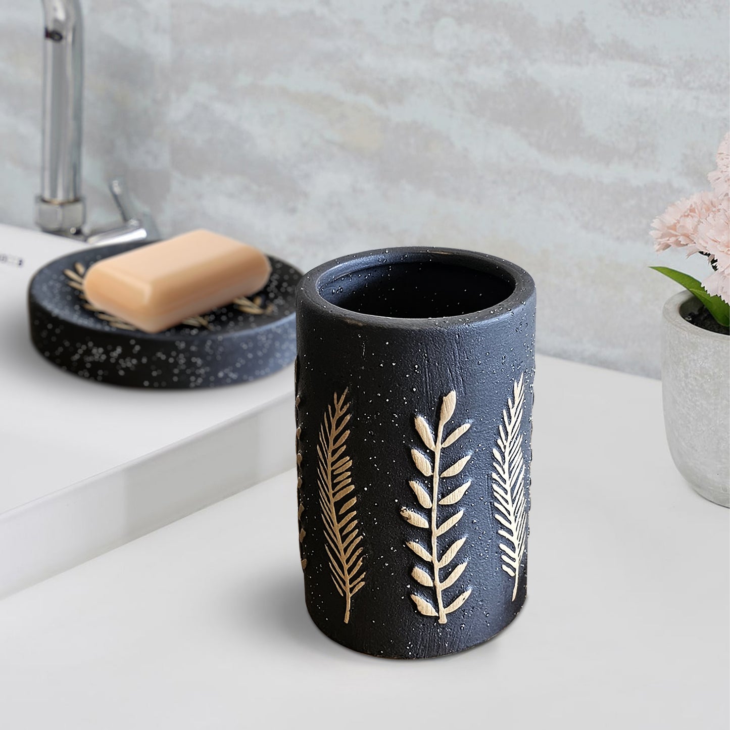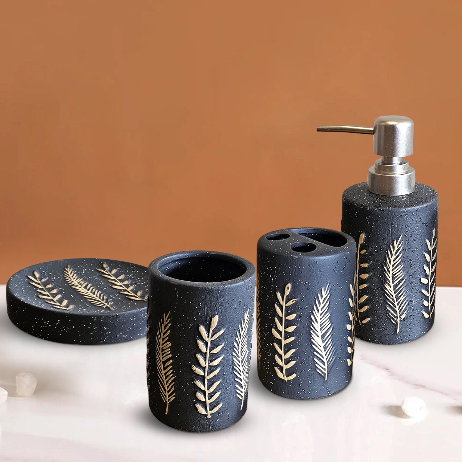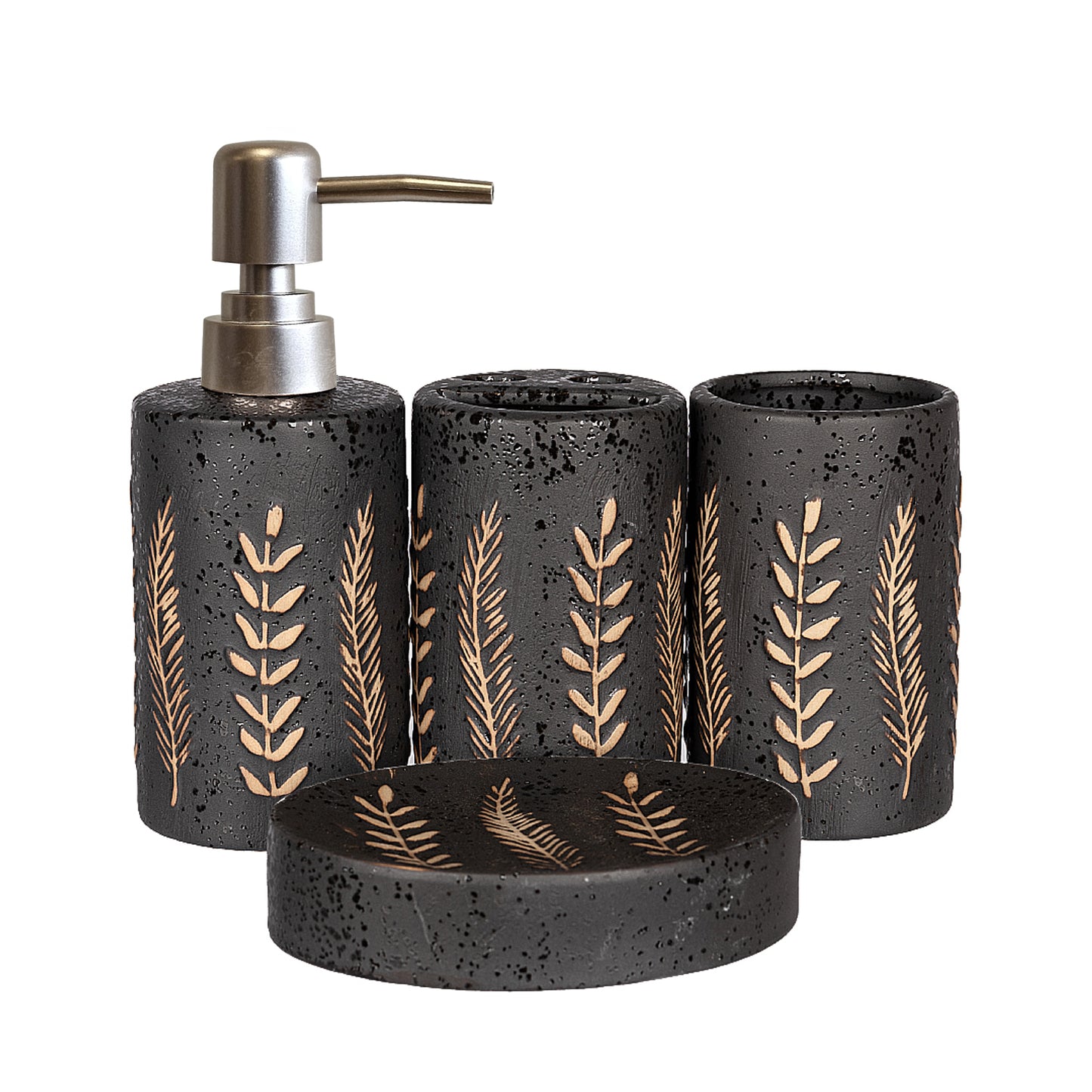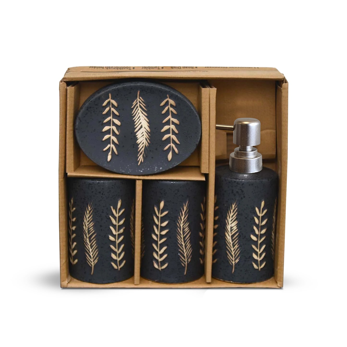 - Included components: Toothbrush Holder, Lotion Dispenser, Tumbler, Soap Dish