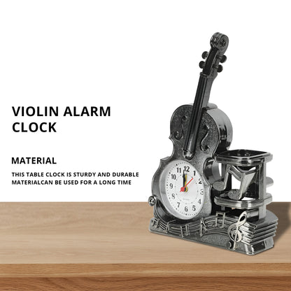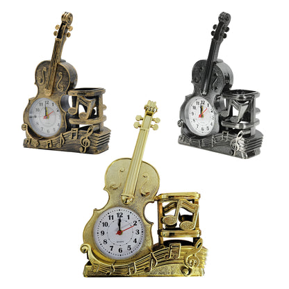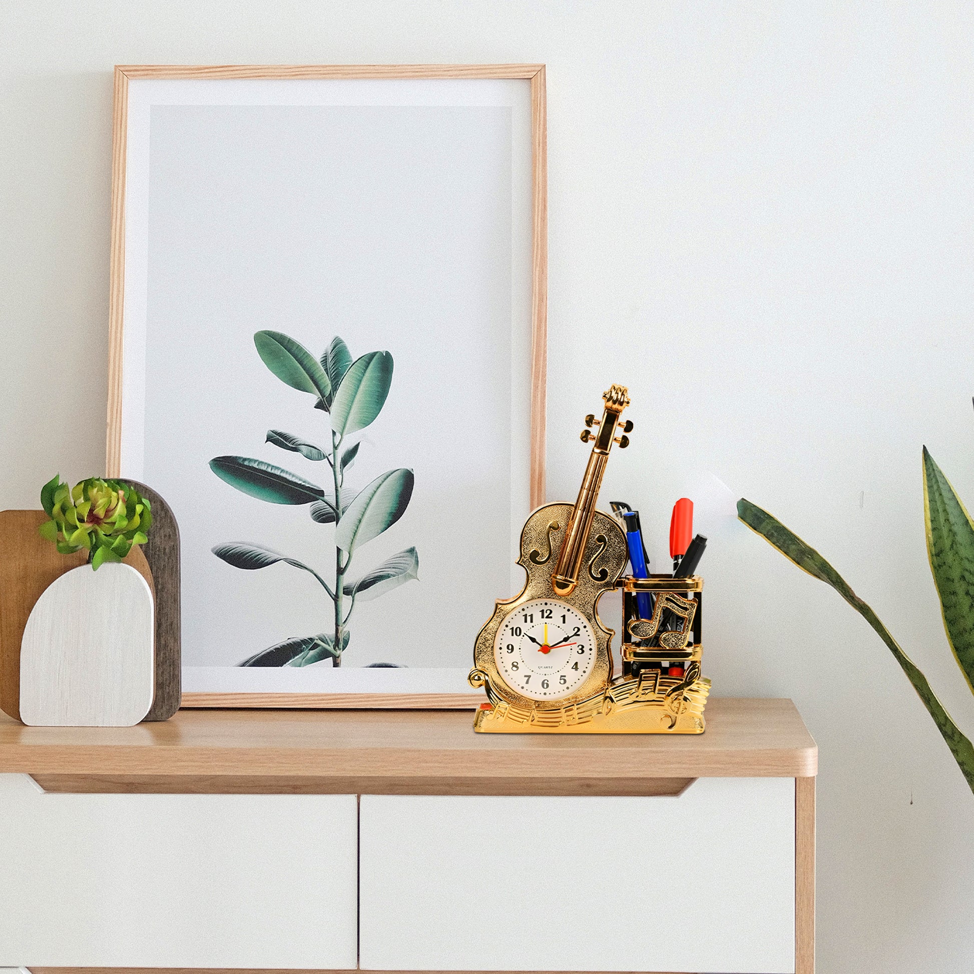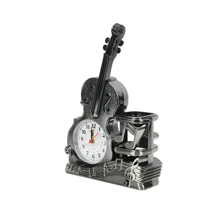 The Violin clock, designed with a built-in storage holder, boasts a unique and elegant violin-style appearance making it an ideal decorative piece for your home.This desk clock with a pen organizer is made of grade plastic material that is durable and has a long service life with no rust.