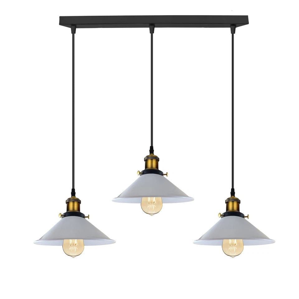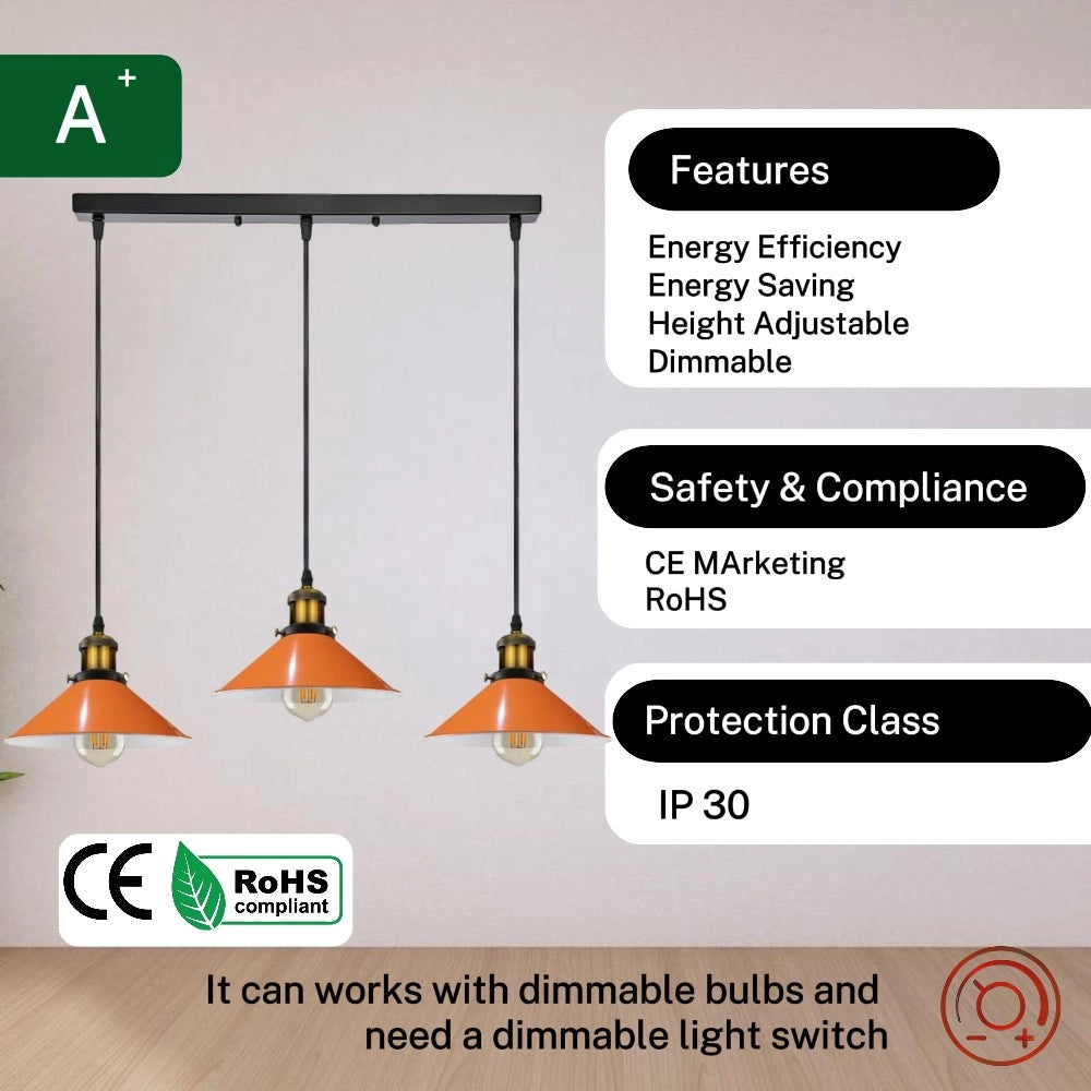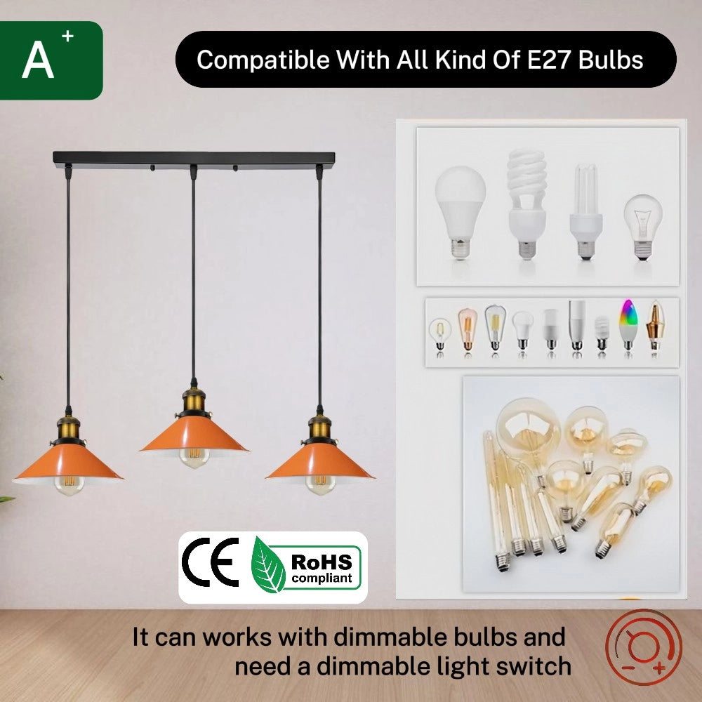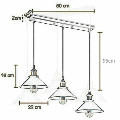 | Package Included | - 3 x Cone Lamp Shades - 3 x 95cm Adjustable Cable with an E27 Lamp Holder - 1 x 50cm Ceiling Rose (Bulb are optional) |