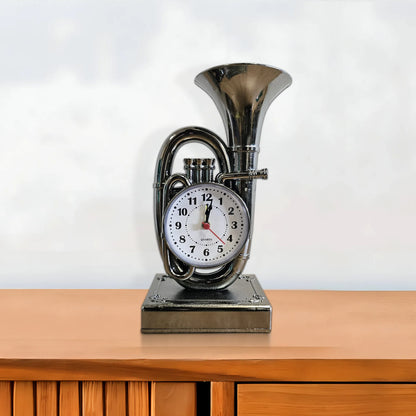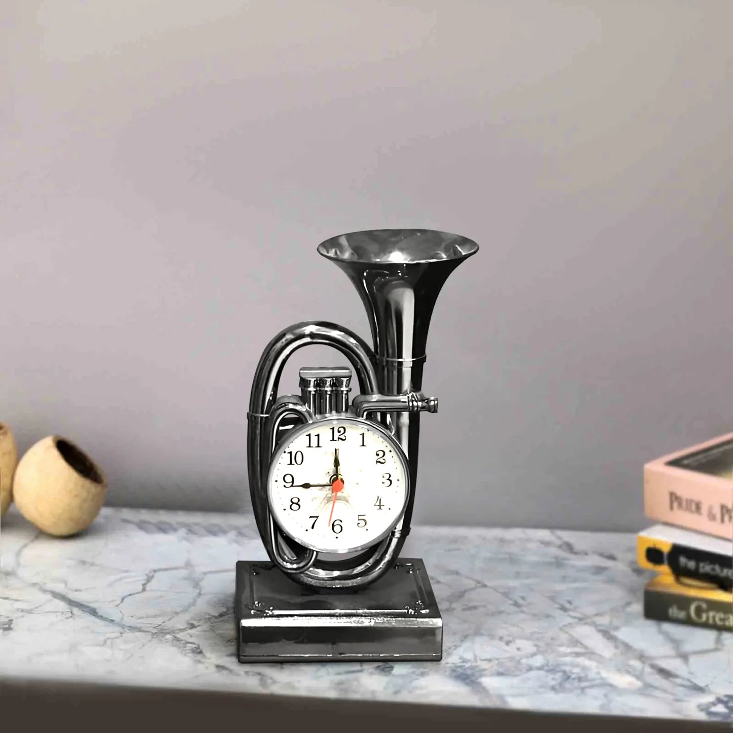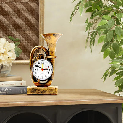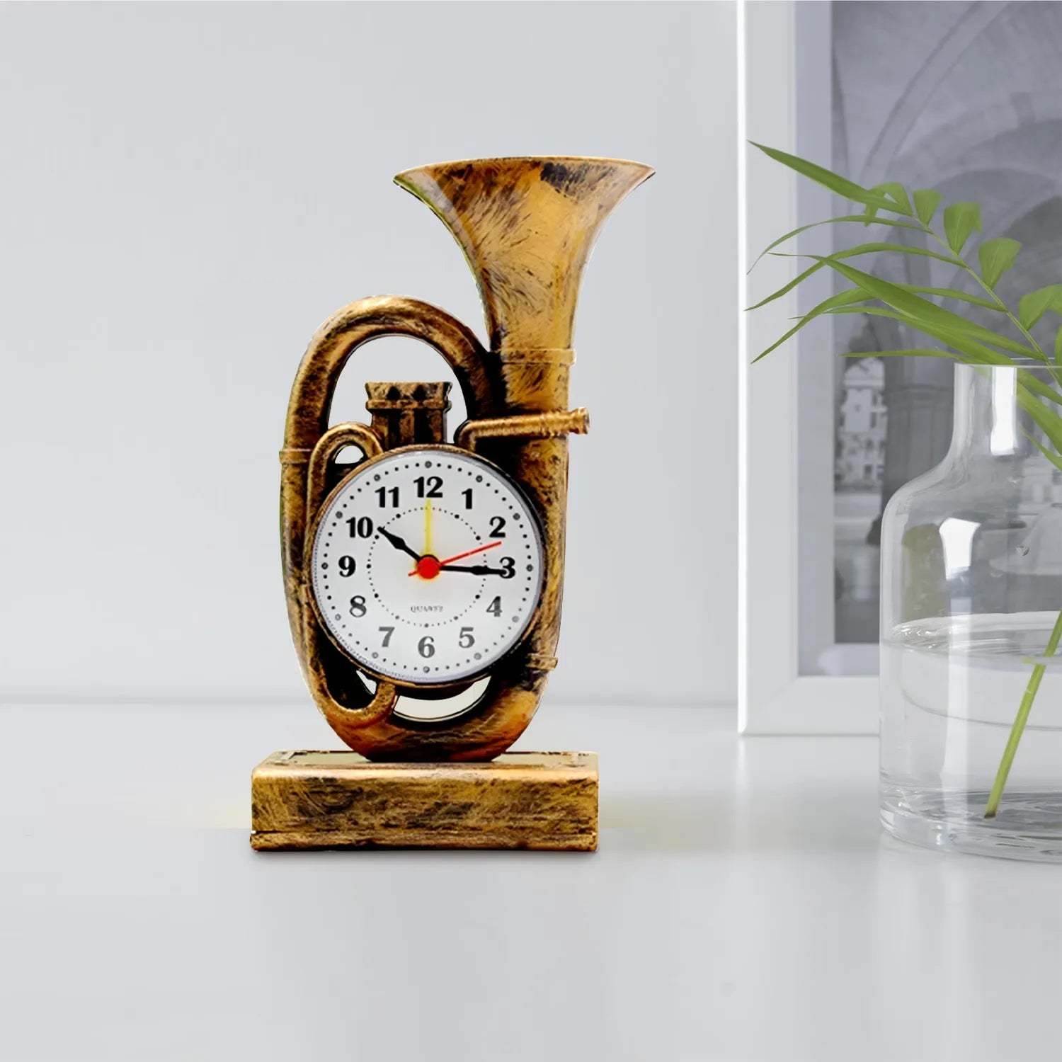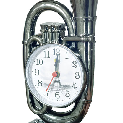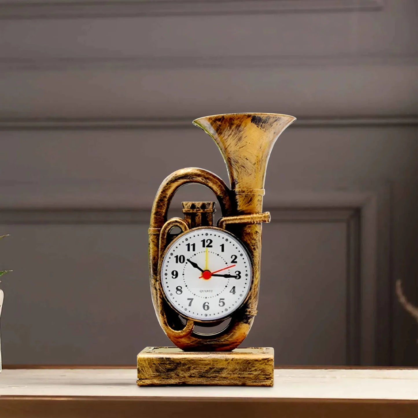 The clock may have a trumpet shape inspired by the musical instrument which makes it a great desktop decoration