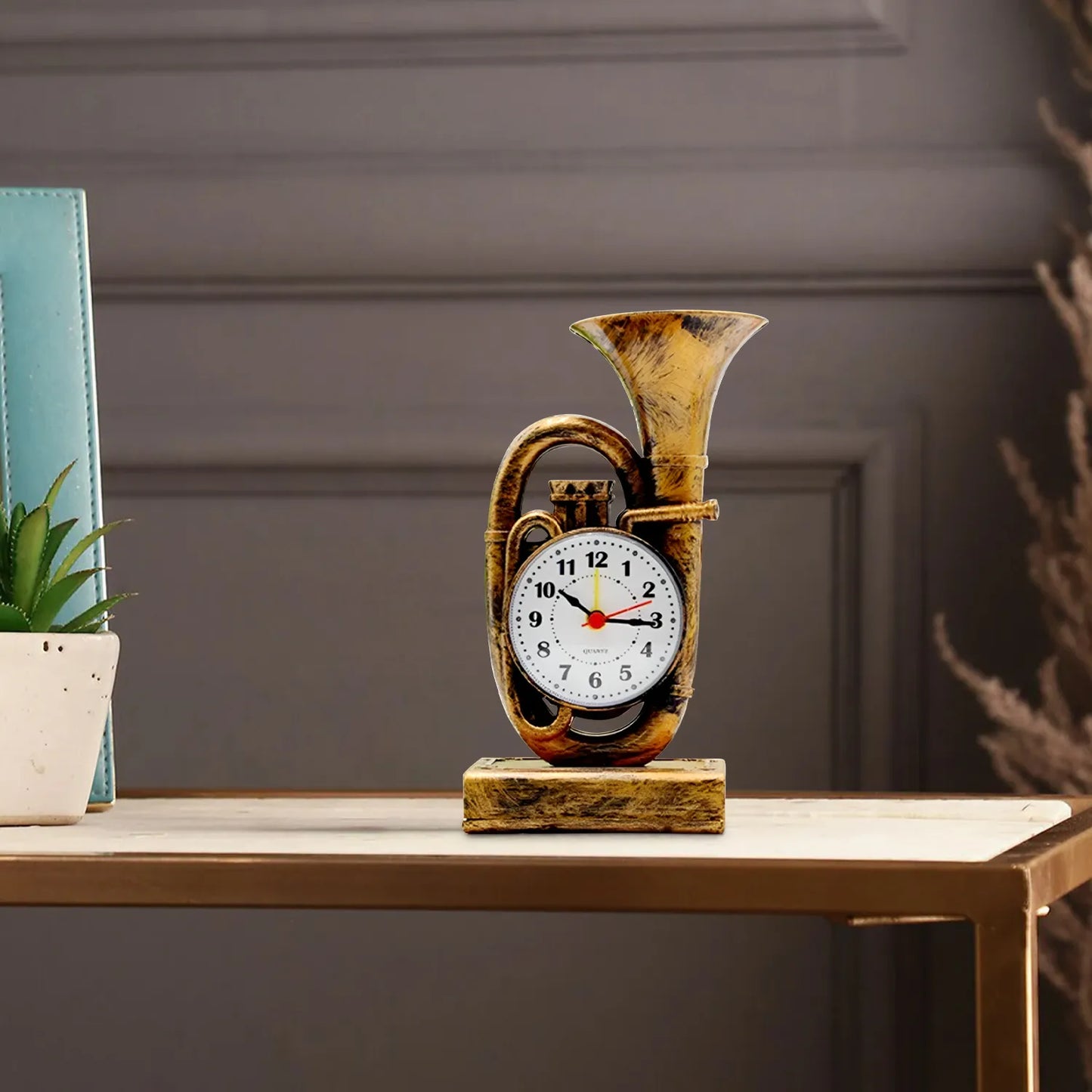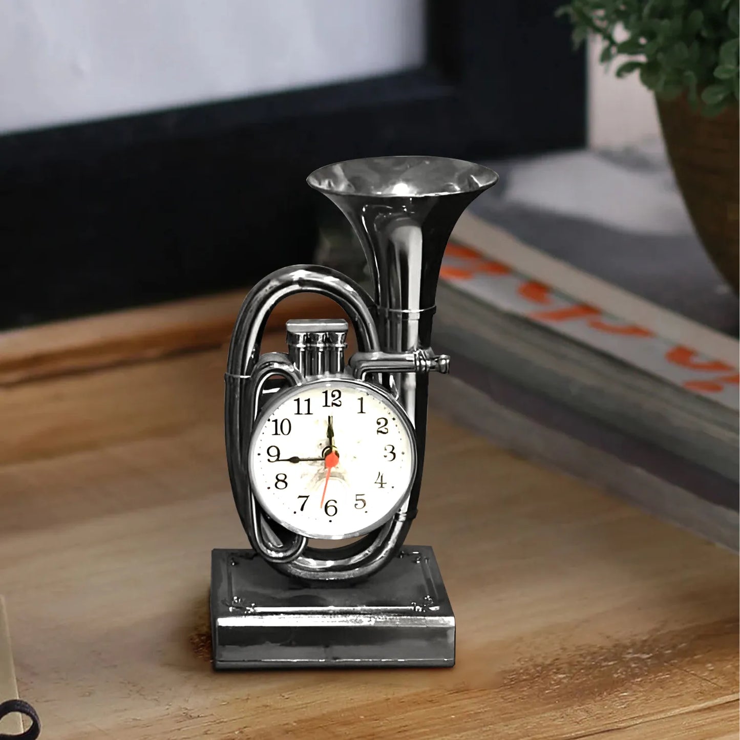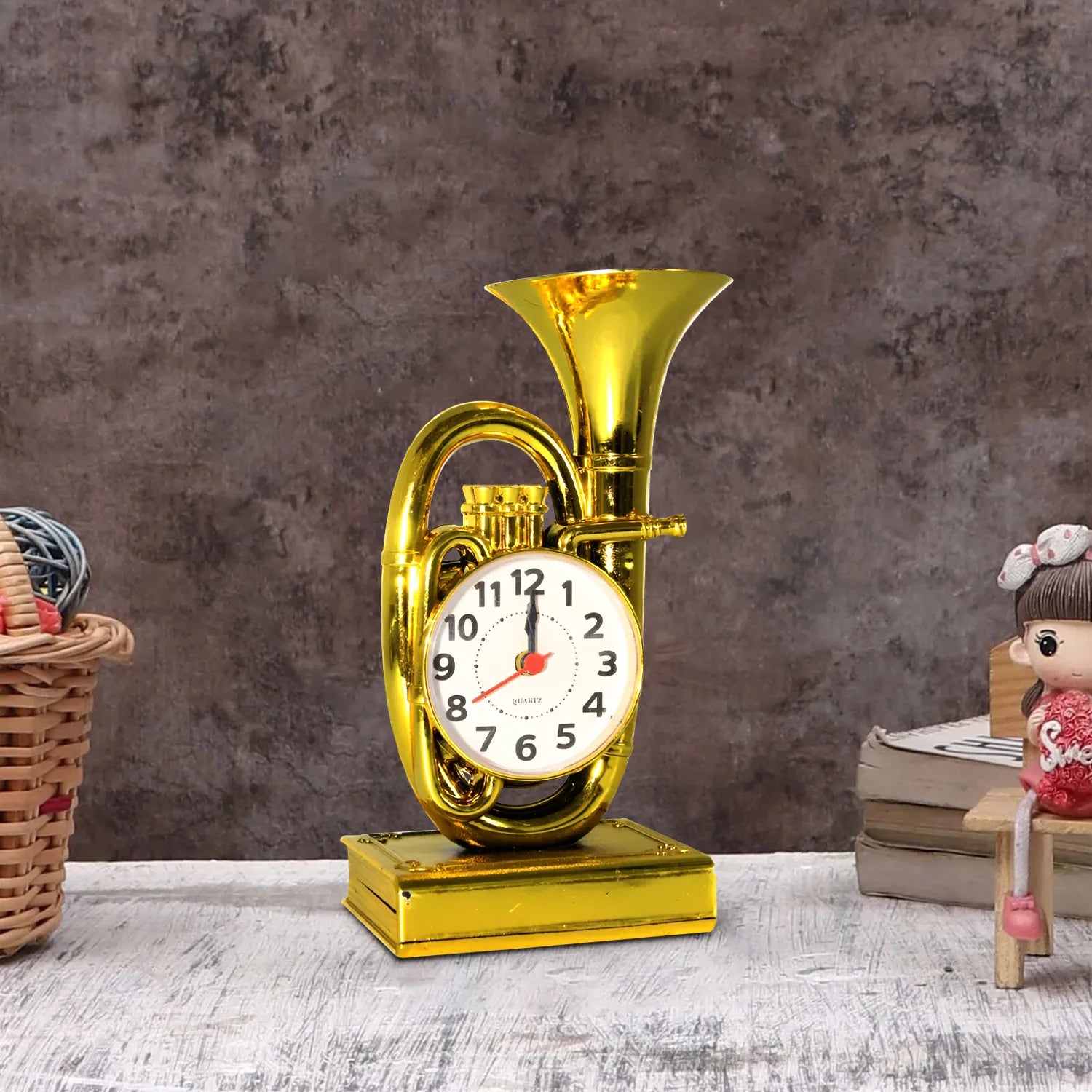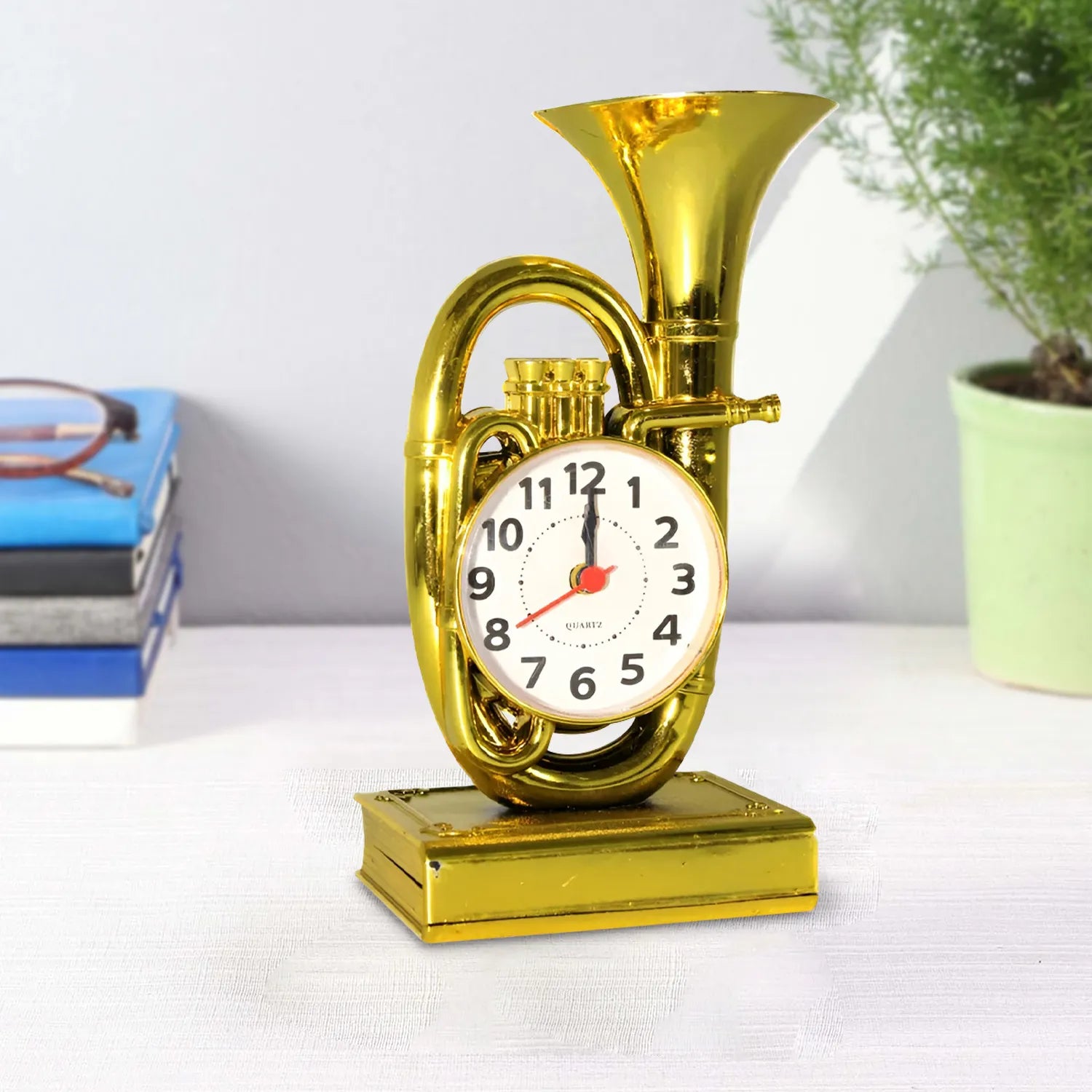 The clock may have a trumpet shape inspired by the musical instrument which makes it a great desktop decoration