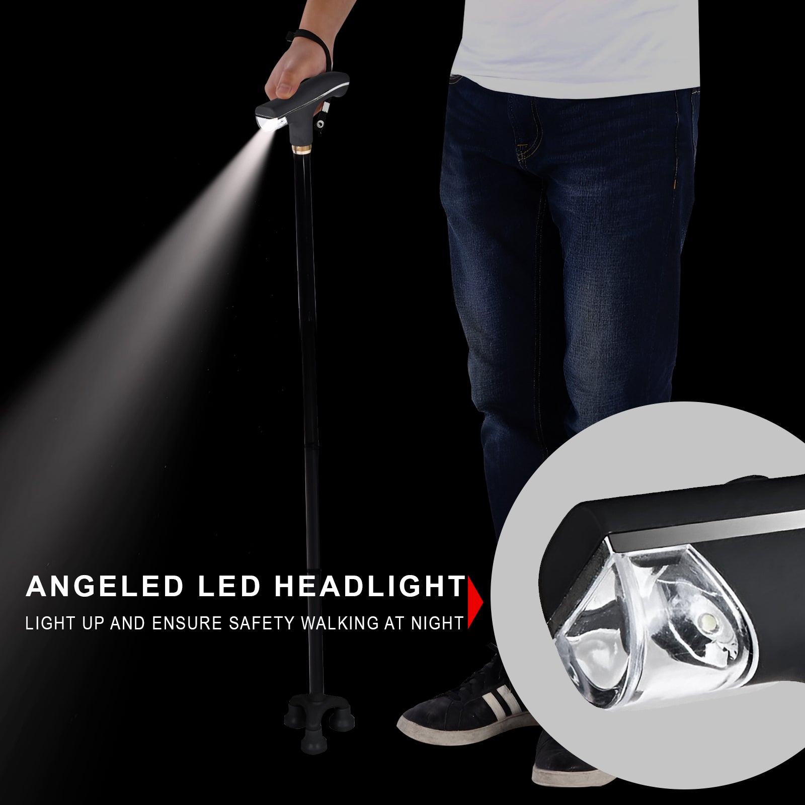 - Walking sticks equipped with LED lights provide safety and guidance in dark environments